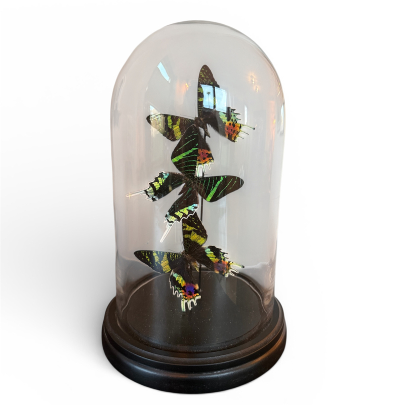 Urania ripheus & Urania leilus vlinders in glazen stolp – 27 cmDeze bijzondere stolp bevat twee Urania ripheus en één Urania leilus. Deze tropische dagactieve motten staan bekend om hun spectaculaire kleuren en iriserende vleugels.